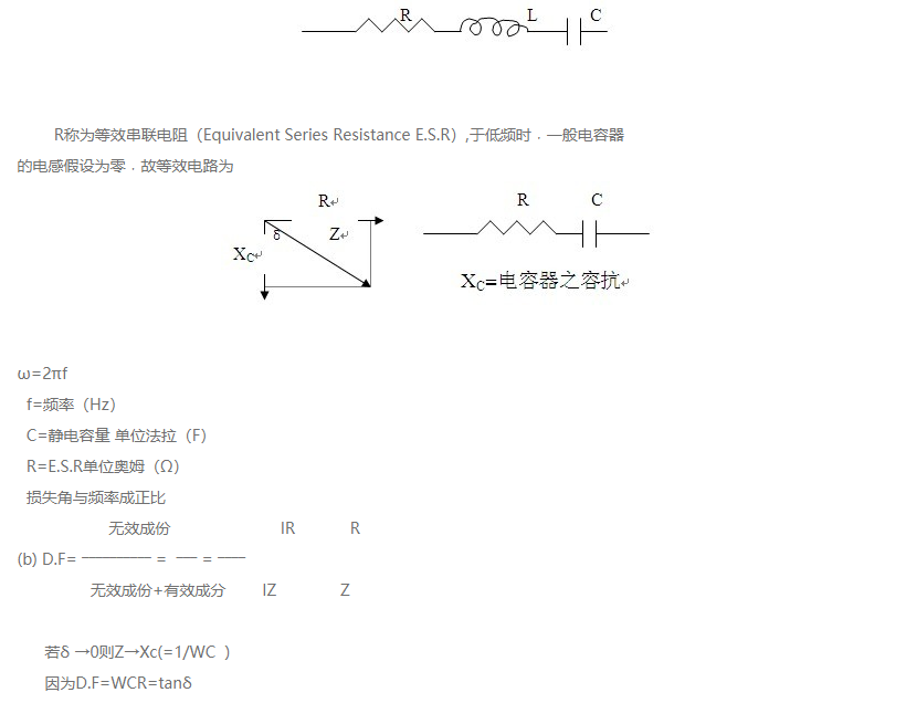 125度電容器----此種電容器具高信賴性﹐一般使用于產業電機﹐如傳真機﹑交換機等﹔其制造注意事項如同105度電容器﹐另部份業者為了將工作溫度提長至125度﹐故于電解液中加入少許的DMF﹐DMF雖能提高工作溫度﹐但含劇毒﹐人體應避免接觸﹐其等效電路含有電感值﹐即﹐低頻時電感可忽略﹐損失角只受電容及電阻之影響﹐即tamδ=WCR,然于高頻時因受電感之影響﹐損失角將改成impedance(Z)﹑而影響Z的三因素為電容抗(Xc),阻抗(R),電感抗(XL),此三者成向量關系。高頻電容器于使用時Z值減小﹐宜選用低倍率的鋁箔及注意導針的壓釘位置﹐導針最好壓釘于鋁箔長度之中央位置﹐以減少電感值。