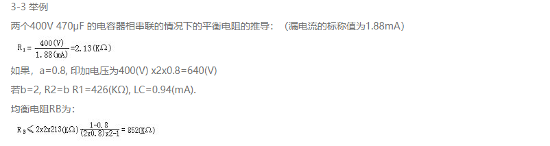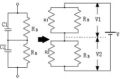 兩個電容器(C1,C2)相串聯,等效電路可用下圖來表示,均衡電阻RB的計算公式可表示如下