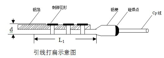 3, 對冷鉚接,它靠刺鉚針使引線和鋁箔機械地鉚接住,控制工藝參數有打扁厚度、接觸電阻和刺鉚花形等,打扁尺寸參照下圖