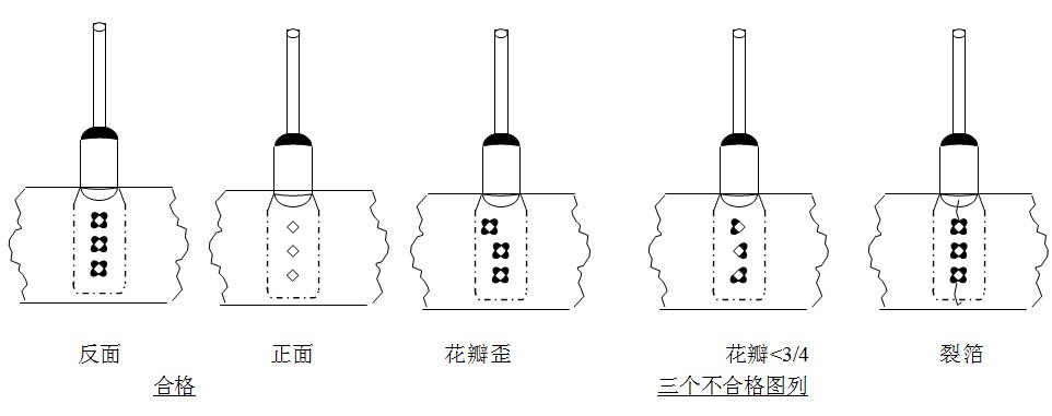 2.3刺鉚花形:要求刺鉚花瓣要大、清晰。花瓣在引線正中心,幾個花瓣中心成一條直線。花瓣要有3/4以上為合格