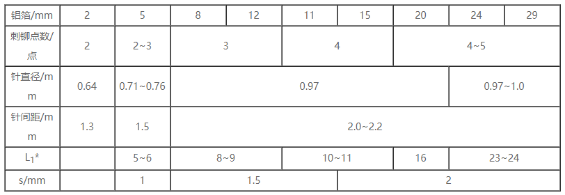 刺鉚在刺鉚機上進行,能自動地將引線在鋁箔規定的位置上刺鉚,兩引線間距就是結構設計的鋁箔開片的長度。引線與鋁箔的相對位置、打扁厚度、刺鉚花形及接觸電阻等參數均可根據設計需要加以調整,使之達到最佳工藝要求。