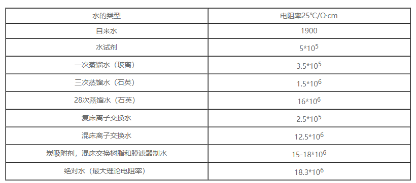 利用電導儀測定測定水的電阻率。電阻越高越好,表示水中的離子數越少。對于要求較高的電解電容器生產用純水,電阻率越高就越好。在電解電容器生產酸制電解液用的純水水質要求就更高,否則會影響到產品性能和壽命特性等,下表列出了各級水的電阻率