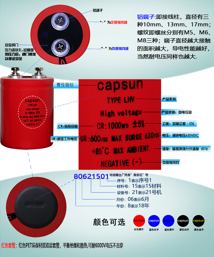 LHV系列,在環境溫度+40℃、疊加2倍額定紋波電流條件下,耐用壽命最長150,000小時。此系列電容擁有各種耐高電流的英制和公制螺紋端子。固定方法可選擇三腳綁帶安裝或者底部螺栓安裝。