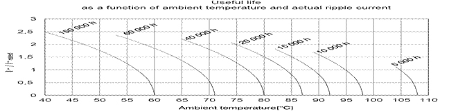 × 鋁電解電容器由于在紋波電流疊加時自我發熱、溫度上升而老化,每升溫5℃壽命減少一半。