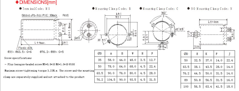 Insulation Withstanding Voltage | When a voltage of 2,000Vac is applied for 1 minute between the terminals that are connected to each other and to the mounting clamp on the insulating sleeve covering the case, there shall not be electrical damage.。 | |||||||||||||||||