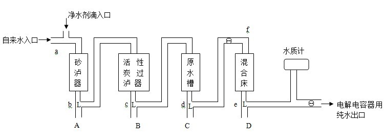 混床法:它是將陽離子交換樹脂和陰離子交換樹脂按總交換容量相等配比混合(以一份重量的陽離子交換樹脂與兩份重量的陰離子交換樹脂混合),裝于一個交換柱中。該法占地少流速大,水的純度高,可以間歇操作。此法較為科學,故許多工廠利用此法制電解電容器生產用純水,其制電解電容器生產用純水系統裝置圖 如下