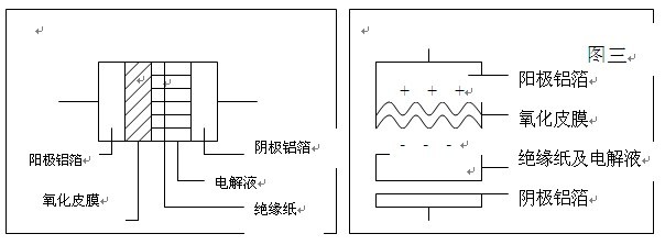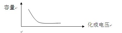 1-1化成電壓與氧化皮膜厚度及容量之關系。鋁箔經各種電壓化成后﹐其氧化皮 膜厚度完全不相等。高壓化成的鋁箔其氧化皮膜厚度較低壓化成為厚﹐致使距離增大﹐因此容量較低壓化成為低﹐即氧化皮膜厚度與化成電壓成正比﹐容量則與化成電壓成反比﹐如圖四所示