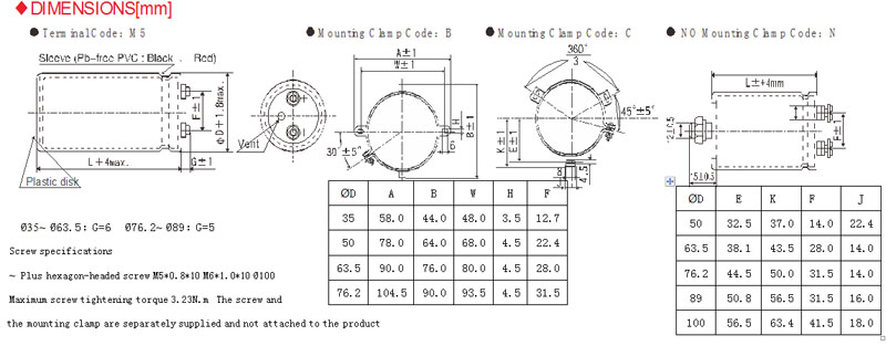 Insulation Withstanding Voltage | When a voltage of 2,000Vac is applied for 1 minute between the terminals that are connected to each other and to the mounting clamp on the insulating sleeve covering the case, there shall not be electrical damage | |||