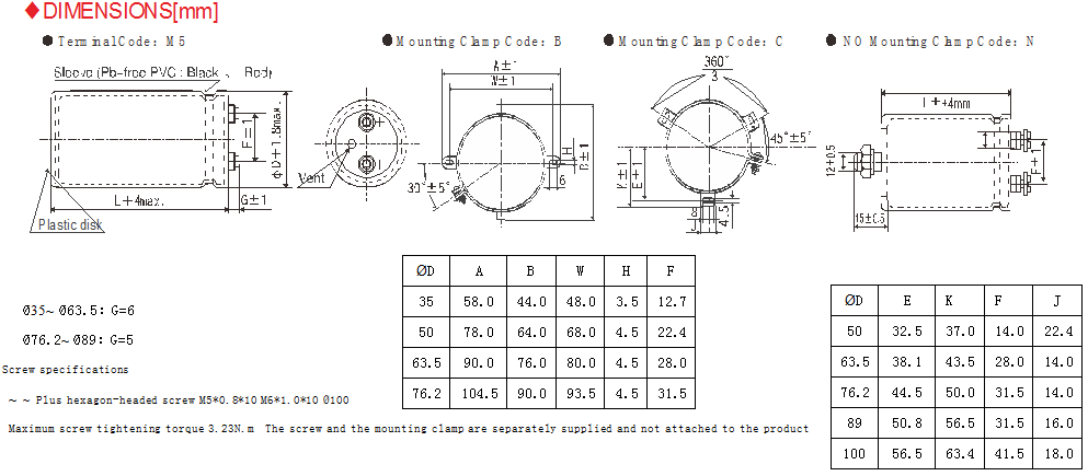 Insulation Withstanding Voltage | When a voltage of 2,000Vac is applied for 1 minute between the terminals that are connected to each other and to the mounting clamp on the insulating sleeve covering the case, there shall not be electrical damage.。 | ||